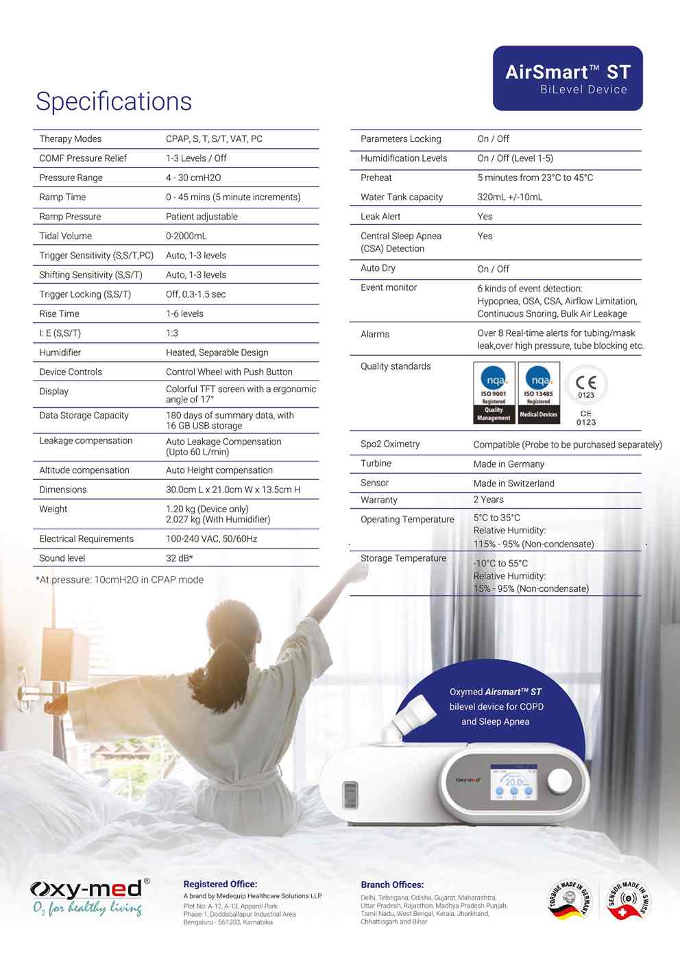 Oxymed AirSmart™ BiLevel ST provides non-invasive ventilation for patients with respiratory insufficiency and sleep apnea. Experience the convenience of customizable backup breath rate and Volume Assured Technology to set Target Tidal volume.