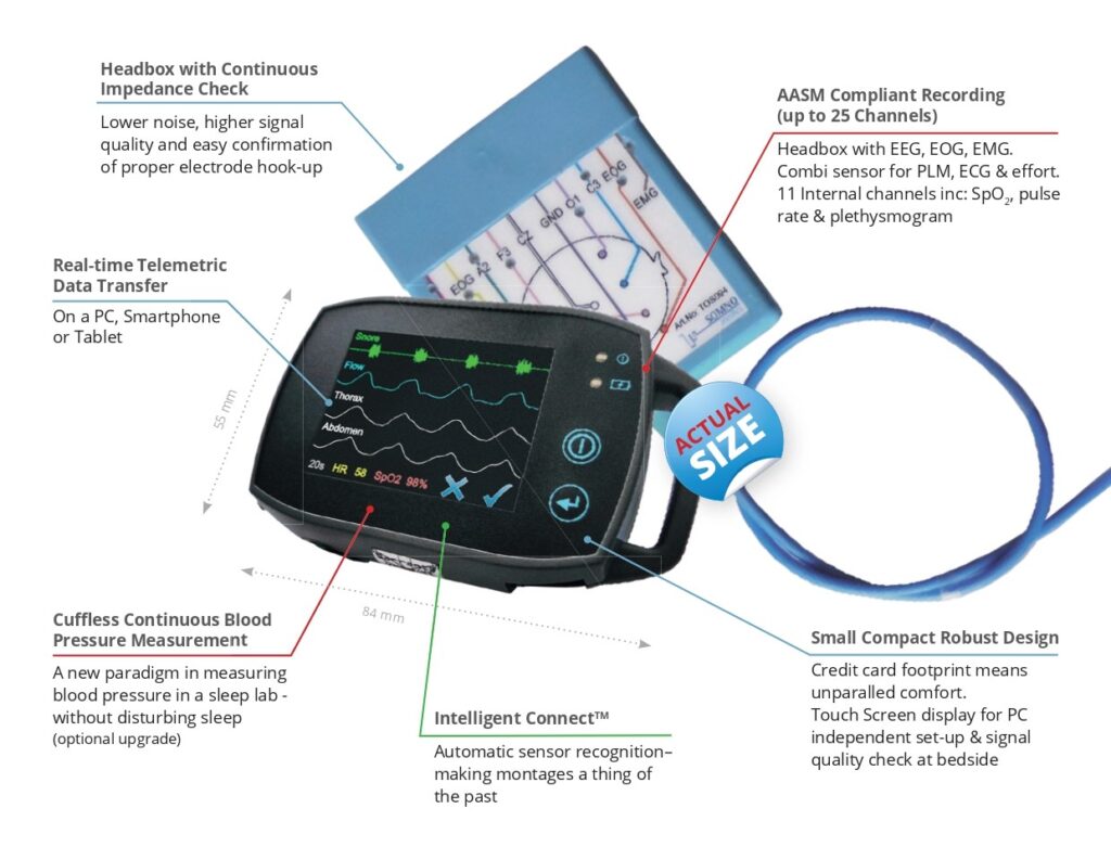 The SOMNOtouch™ PSG combines the comfort, function and power of much larger sleep diagnostic devices in a small perfectly formed size. At only 64 g and 84 mm x 55 mm it is one of the lightest yet powerful touch screen ambulatory/stationary polysomnography devices on the market today.